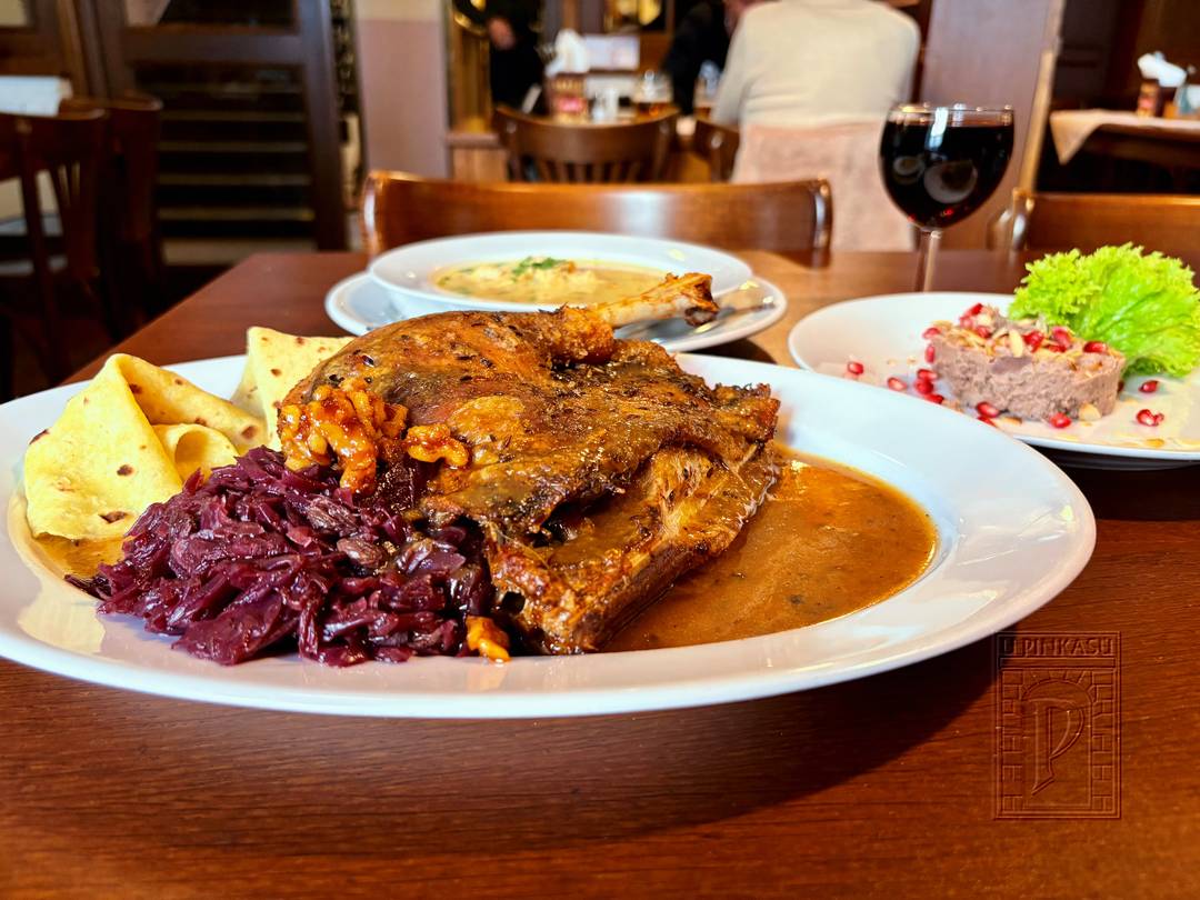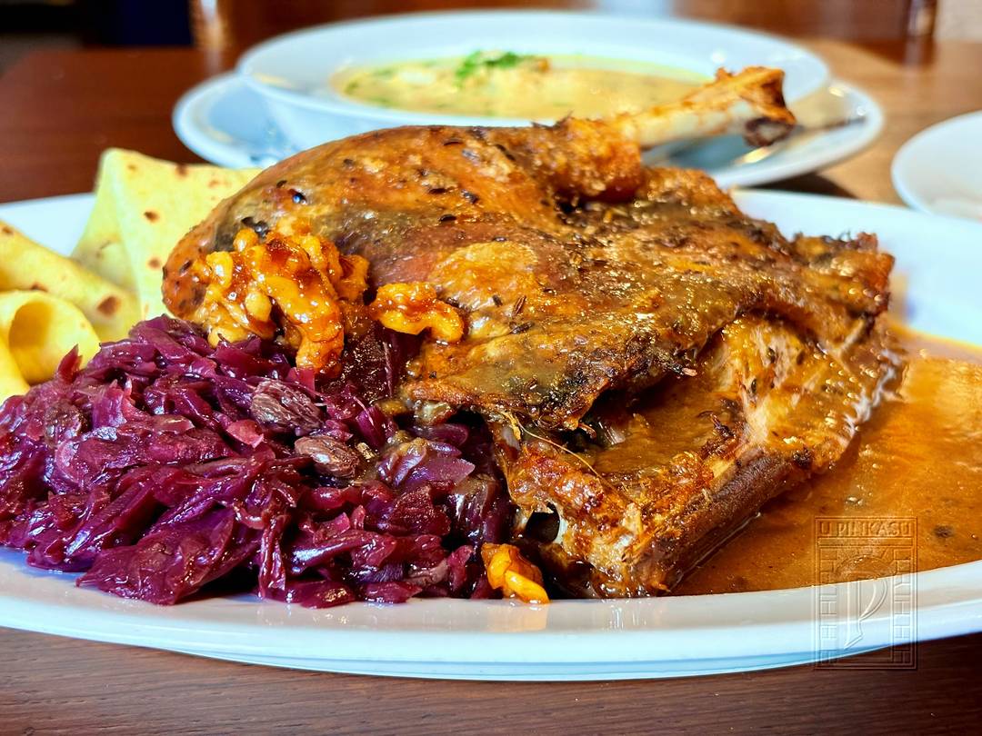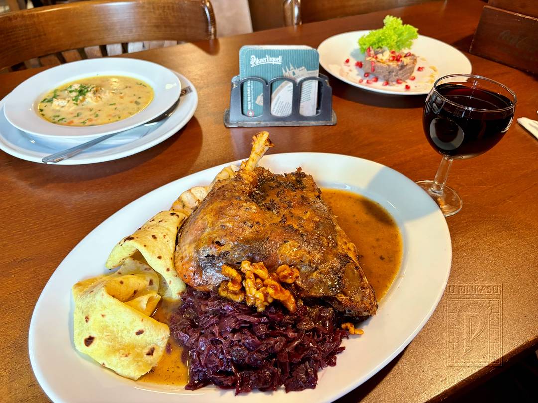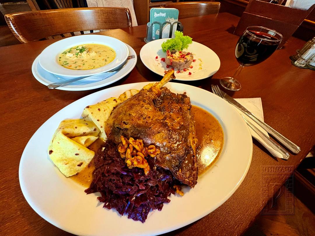 - 1/4 Svatomartinské husy na jablkách a majoránce pečené, s červeným ořechovým zelím, lokšemi a perníkovým knedlíkem podávané … 699,- Kč
