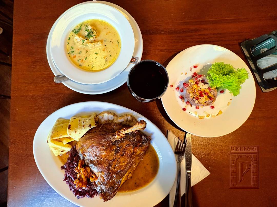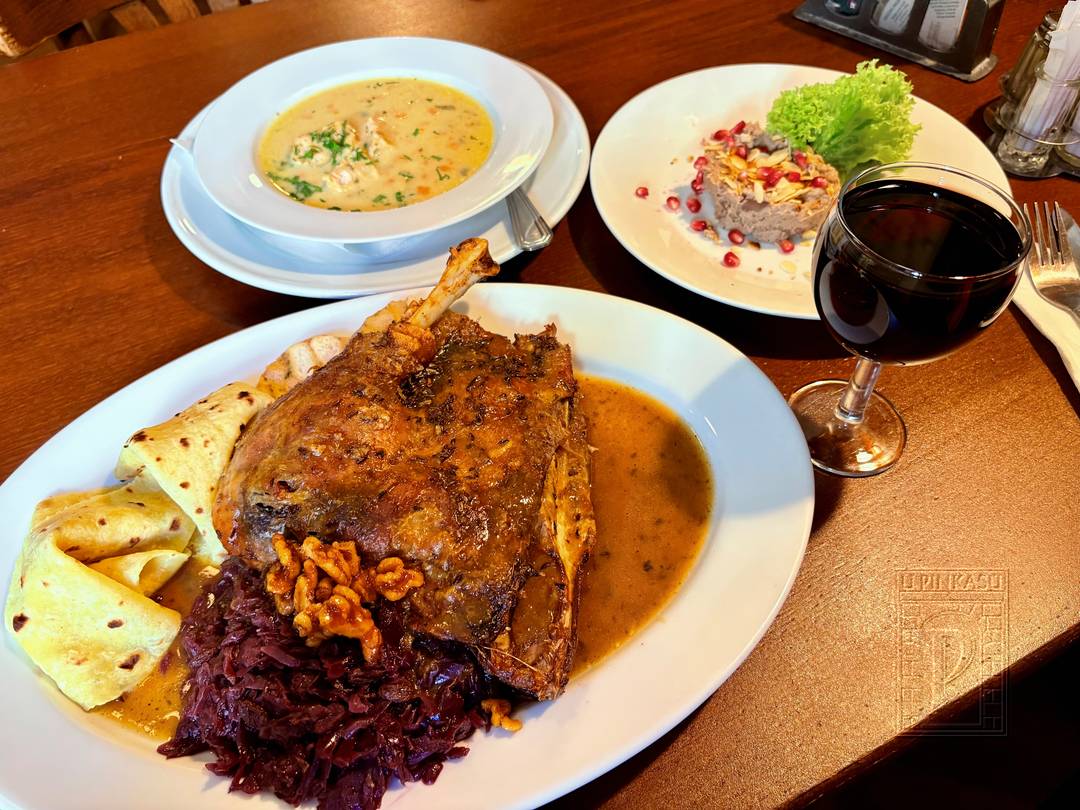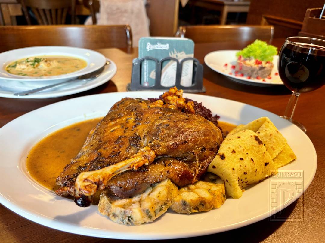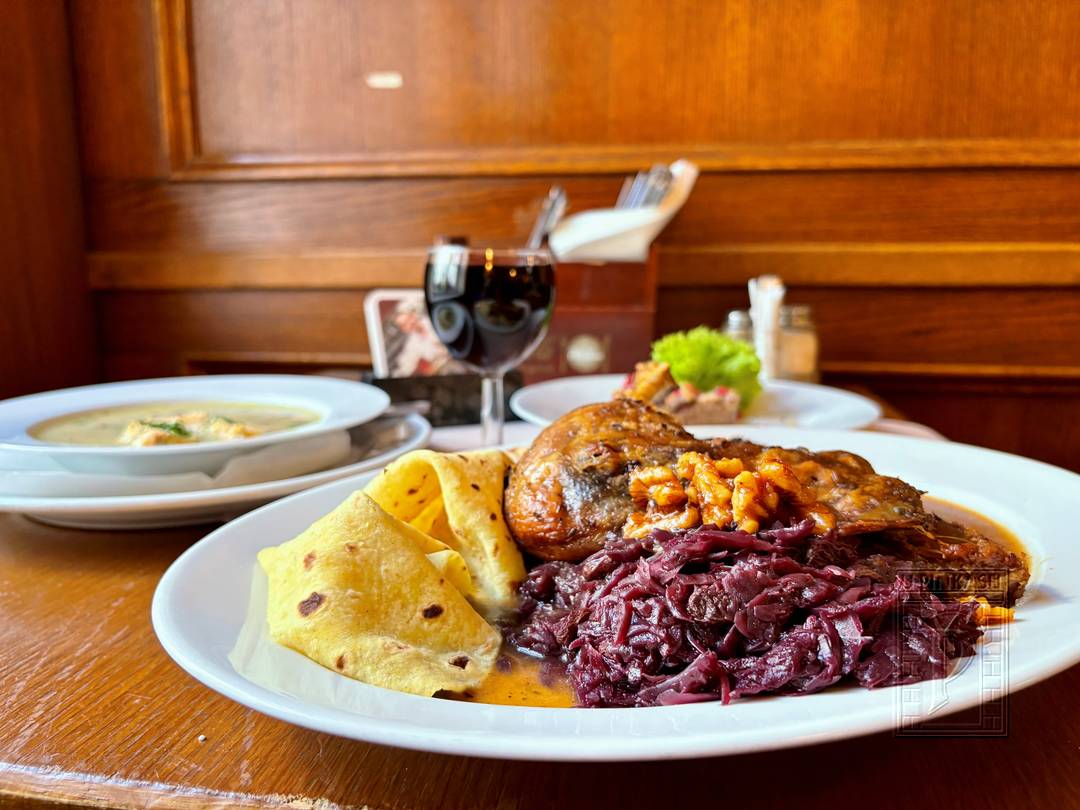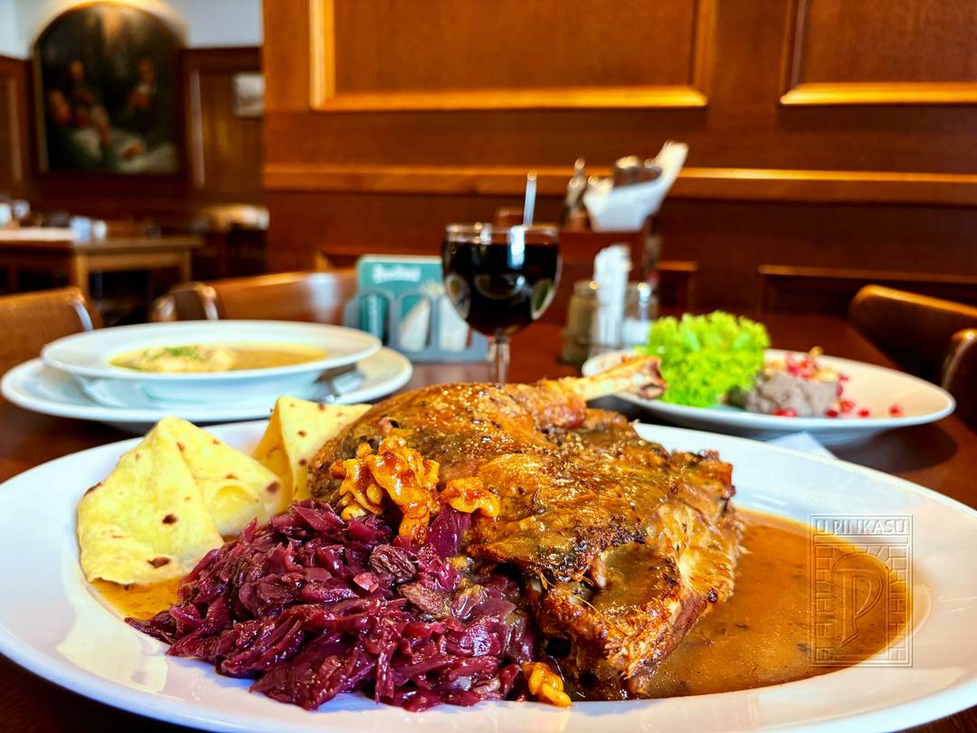 - 1/4 Svatomartinské husy na jablkách a majoránce pečené, s červeným ořechovým zelím, lokšemi a perníkovým knedlíkem podávané … 699,- Kč